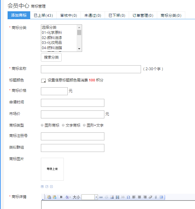 在此頁面可以根據(jù)自己實際情況,選擇要發(fā)布的商標信息,包括:商標類別、名稱、價格(包括出售價及市場價,市場價僅供買家參考)、申請時間、類型、注冊號、類似群組、圖片上傳以及簡要的文字說明,確認無誤后即可點擊提交,待我們客服人員審核完畢后,即可在前臺出現(xiàn),成功上架。