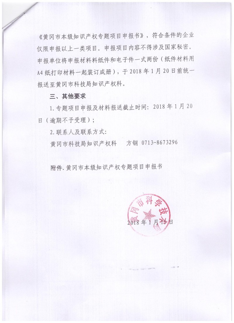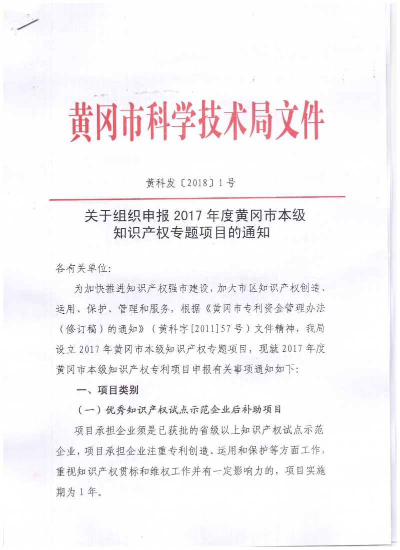 關(guān)于組織申報(bào)2017年度黃岡市本級(jí)知識(shí)產(chǎn)權(quán)專題項(xiàng)目的通知